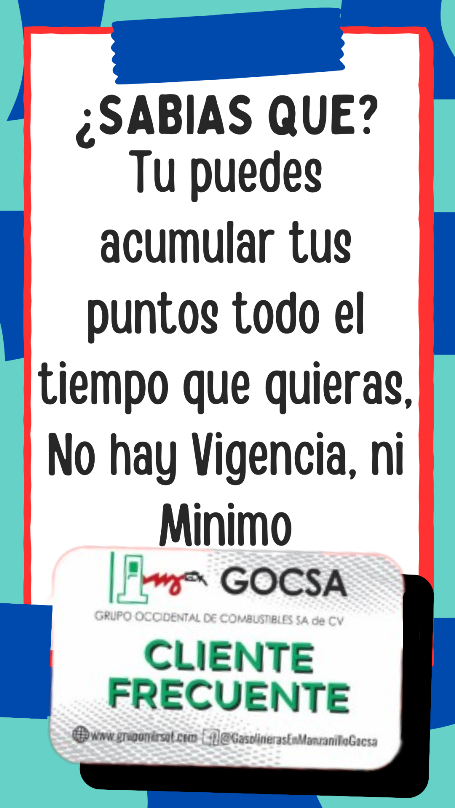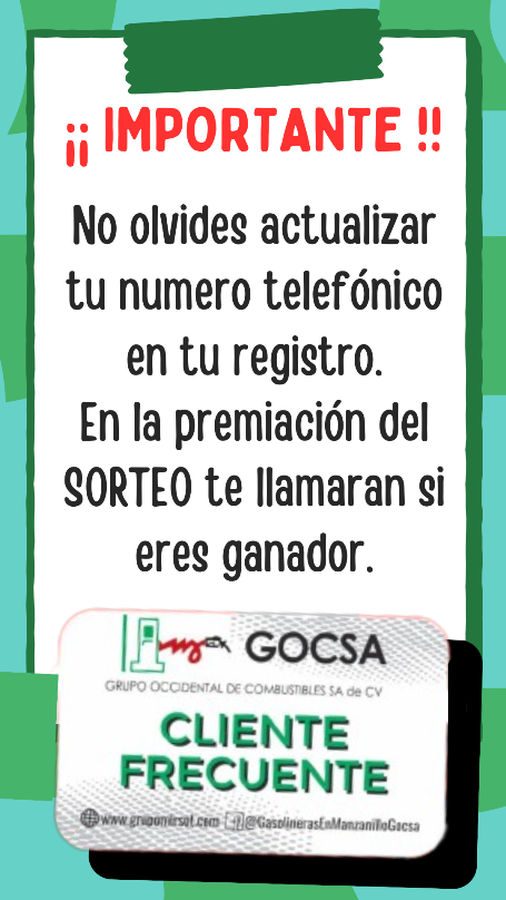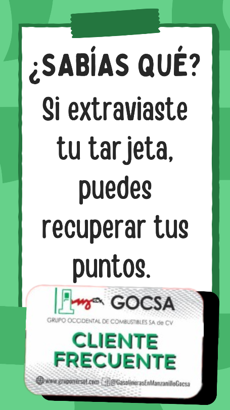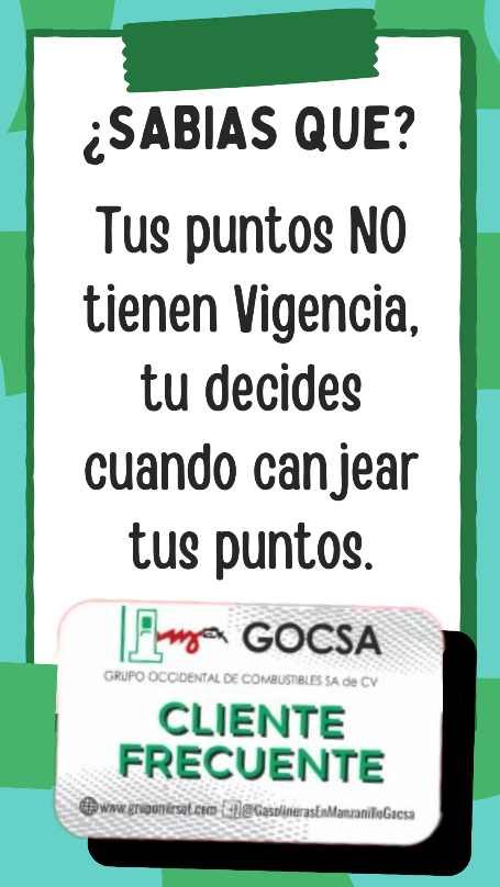 Grupo Occidental de Combustibles S.A. de C.V. ha decidido lanzar una campaña de fidelización de clientes de CONTADO, con una tarjeta de CLIENTE FRECUENTE la cual serviría para acumular puntos por cada litro cargado de gasolina PREMIUM Y MAGNA. Esto se llevará a cabo a partir del día 02 de diciembre de 2019.